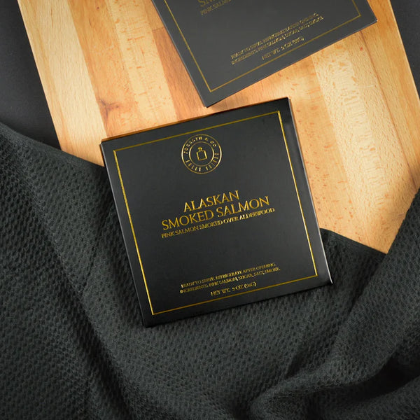 Fresh wild caught salmon from Alaskan waters are hand filleted and naturally brined. The filets are then slowly smoked over natural alder wood giving it a delicate earthy and smoky flavour profile.