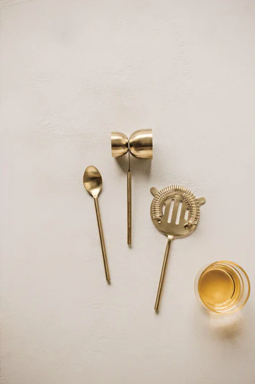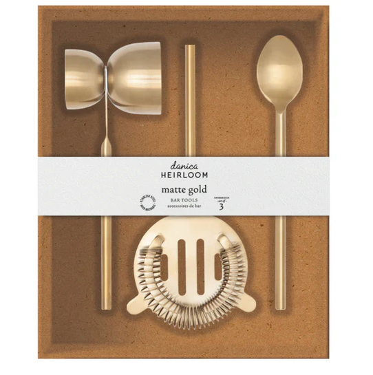 - Danica Heirloom Matte Gold Bar Tools set of 3 Bringing a mix of shine and sophistication to the bar cart, this set of bar tools has everything you need to craft elevated cocktails at home.