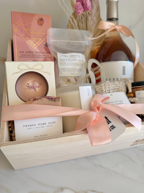 A beautifully curated moment of calm, indulgence, and celebration. This luxe gift box blends spa-level self-care with sweet treats and a bottle of rosé—perfect for birthdays, thank-yous, bridesmaids, or simply spoiling someone special.